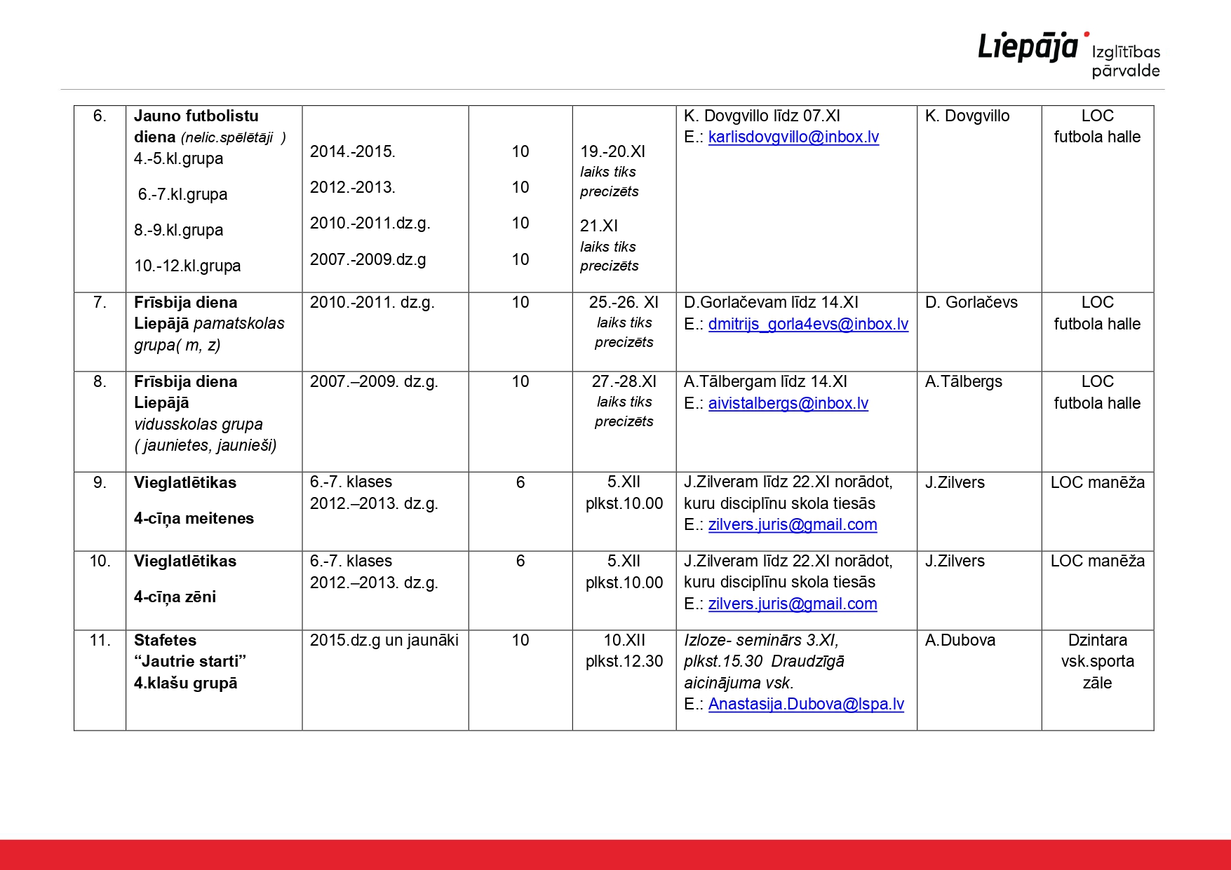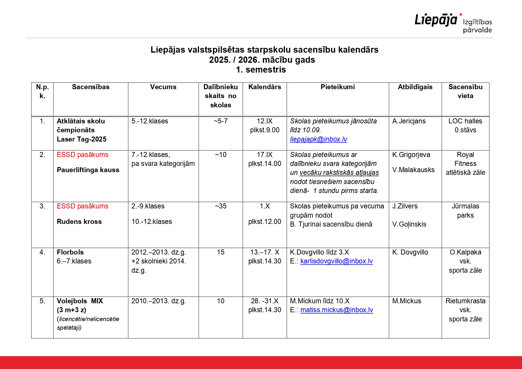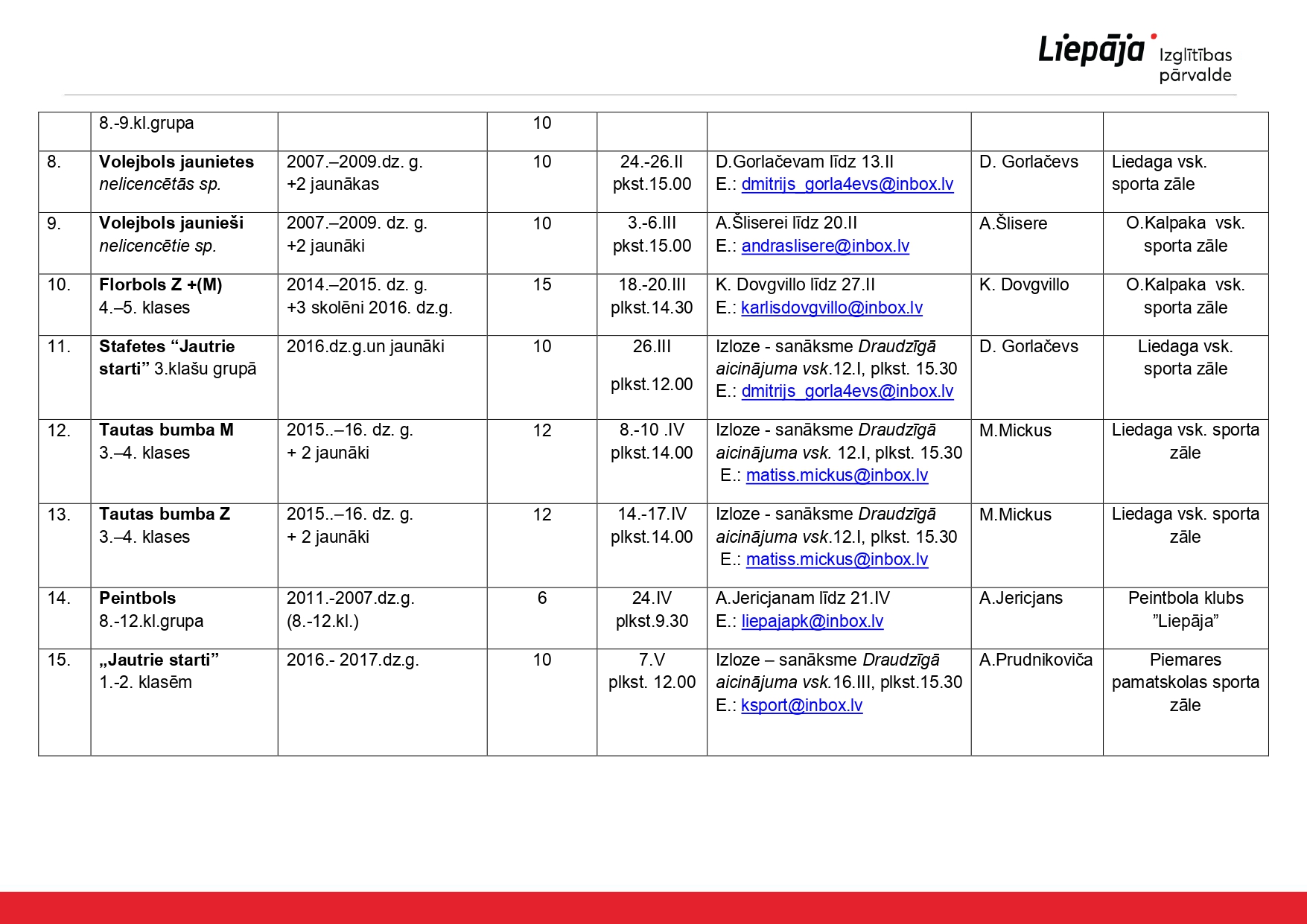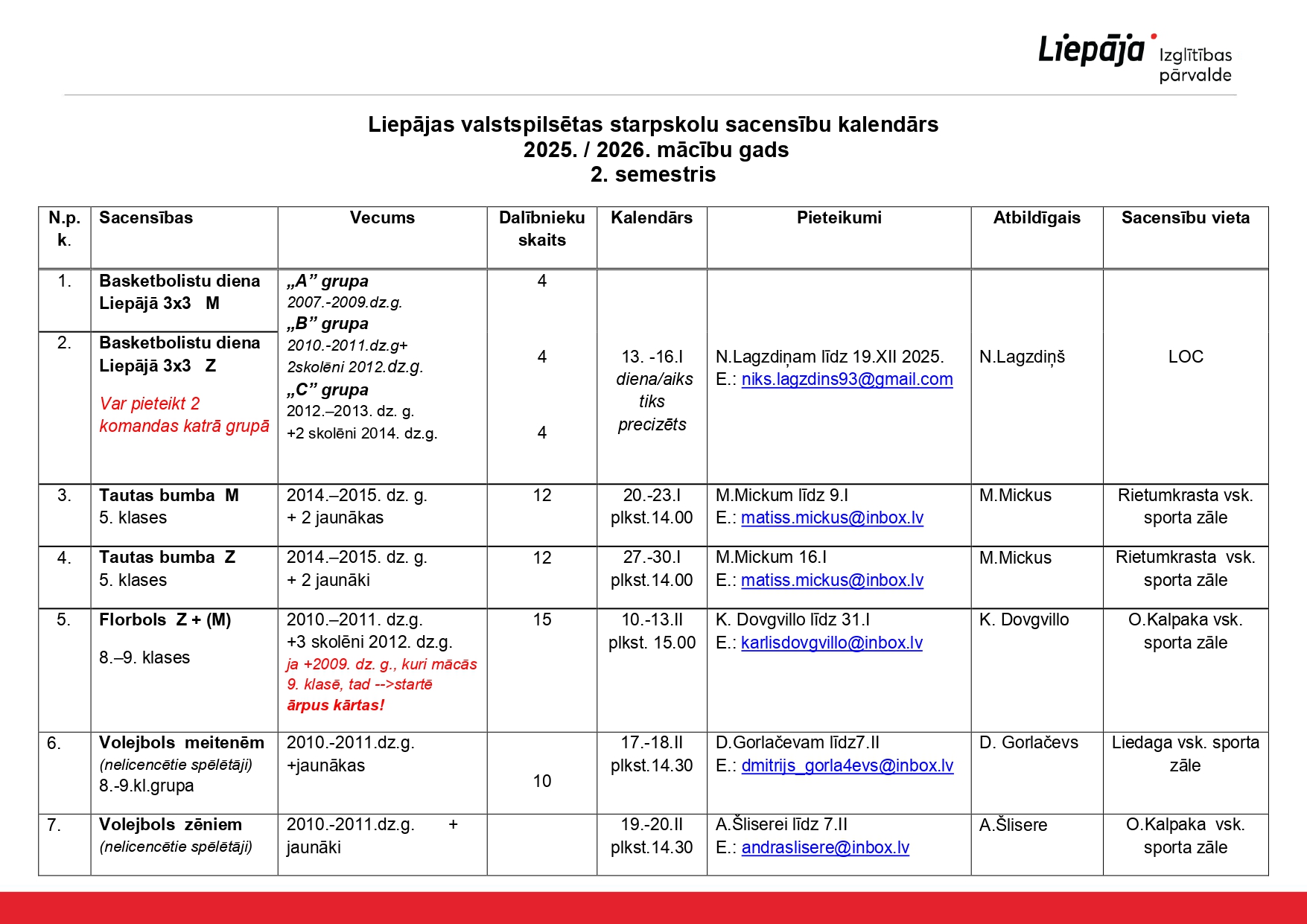 Olimpiāžu, konkursu un sporta sacensību grafiki un kārtības Liepājas Izglītības pārvaldes mājas lapā.